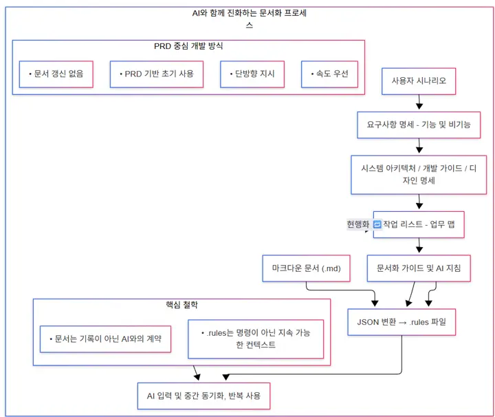 This illustrates a systematic documentation and development process with AI. It captures the core of document-based AI collaboration, starting from requirement specifications to system architecture, task lists, and documentation guides, creating AI instructions as a .caretrules file, which the AI then repeatedly uses as input. The philosophy that "documentation is a contract with AI, not a record," and "rules are a sustainable context, not a command" is crucial.